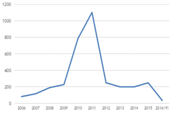 圖1全毬MOCVD機檯纍計安裝(zhuang)量 數據來(lai)源:咊訊理財客
